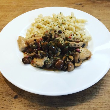 Ein echter Klassiker, der immer wieder gut schmeckt – vor allem, wenn das Wetter draußen wieder frischer wird – ist Geschnetzeltes Zürcher Art. Ich bereite es am Liebsten mit Putenfilet und Cremechampignons zu. Eine tolle Beilage dazu sind selbstgemachte Nockerl.