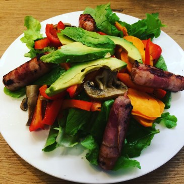 Sommersalat mit Ofengemüse, Süßkartoffelchips und Mini-Würstel
